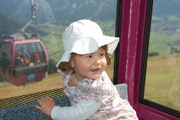 Wir waren natürlich auch mal oben auf den Bergen, das steilste Stück des Weges durfte ich mit der Gondel fahren, was - wie man sieht - eine echte Gaudi war. Oben auf dem Berg hat der Papa mich dann mit der Rückentrage ein bißchen rumgetragen und ich durfte auf der Hütte Brotzeit machen und Eis essen. Lecker ...